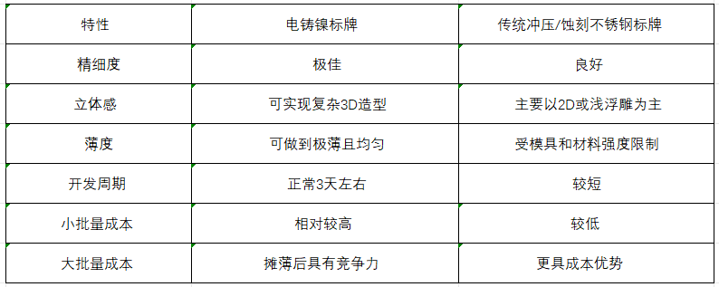 電鑄可以生產出壁厚均勻且極薄(0.04mm起) 的標牌,既節省材料、減輕重量,又因為鎳本身的高強度而保持足夠的結構剛性。